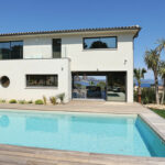 Construction d’une maison de 330 m2 répartie sur 3 niveaux avec une vue imprenable de 180° sur la mer. Le salon offre un panorama exceptionnel avec ces menuiseries de 8 m de long. L’étage est composé d’une grande chambre master de 50 m2 avec une terrasse en gardes corps vitrés et bois Padouck, ainsi que de 2 suites avec un revêtement de sol traité en parquet chêne clair, posé en bâton rompu. Afin de raccorder les étages, mise en place d’un double escalier avec un limon en verre et crémaillère en acier permettant la fixation des marches en chêne Yuzu teinté aux couleurs des ouvrants et des parquets.Sur l’extérieur, une piscine en béton armé d’une forme en «L» avec un rideau de sécurité dissimulé dans les intérieurs des plages, d’une terrasse de 100 m2 traitée en bois padouck, d’une pergola bioclimatique 8×4 m avec lames orientables. L’ensemble des espaces verts ont été pensés avec des essences méditerranéennes. La décoration a été réalisée sur l’ensemble du mobilier intérieur et extérieur. Durée des travaux : 12 mois